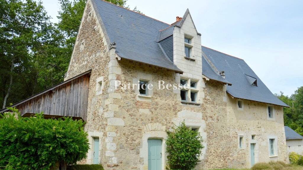 A listed, 15th &17th century house, with an outbuilding and a garden, in the undulating, wooded countryside of the Anjou region.