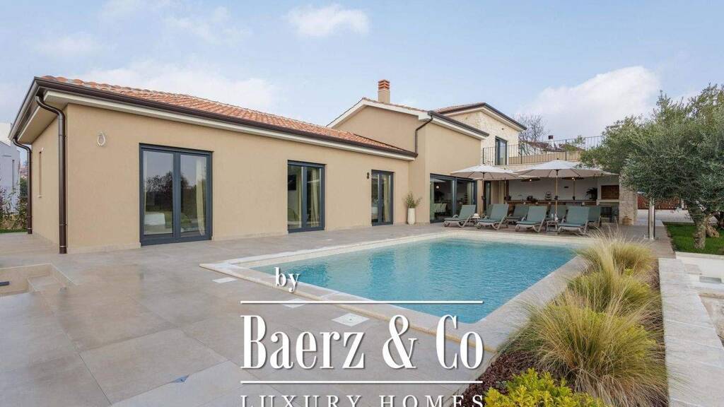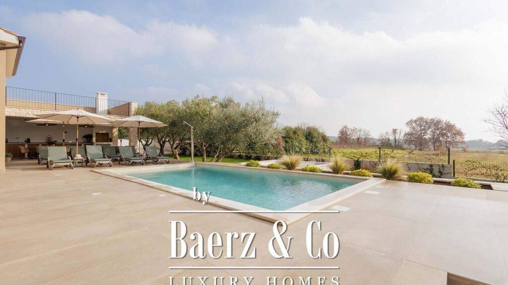pfor sale is a modern newly built villa in authentic istrian style, located in the peaceful area of kastelir - labinci, one of the most desirable parts of western istria. this exceptional property perfectly combines traditional istrian charm with contemporary design and top-class comfort, and is built as a high-standard low-energy home./ppthe villa is spread over two floors and features four spacious bedrooms, each with its own en-suite bathroom. three bedrooms are situated on the ground floor, while the master bedroom occupies the first floor, complete with a private bathroom, walk-in wardrobe, and a large terrace offering a spectacular panoramic view of the sea and the surrounding landscape./ppthe property is equipped with underfloor heating powered by a heat pump and air conditioning throughout, ensuring maximum comfort year-round. underfloor heating is also installed in the outdoor kitchen, emphasizing practicality and thoughtful design. additionally, there are two separate guest toilets./ppthe outdoor area is designed as a true oasis of relaxation and luxury, featuring a fully equipped summer kitchen, sunbathing area, swimming pool, fire pit, and a space prepared for a jacuzzi. the beautifully landscaped garden includes a lush green lawn and six olive trees, maintained by a fully automated irrigation system./ppthis stunning villa offers the perfect blend of authentic istrian elegance and modern luxury, representing an ideal opportunity for those seeking a peaceful residence or a premium investment in the luxury tourism segment of western istria./p
