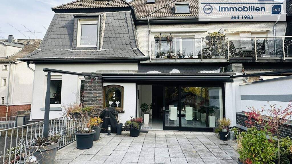 Die außergewöhnlich große Terrasse lädt zu entspannten Stunden im Freien ein und erweitert den Wohnraum erheblich. Eine hochwertige Markise sorgt für angenehmen Schatten und Witterungsschutz.