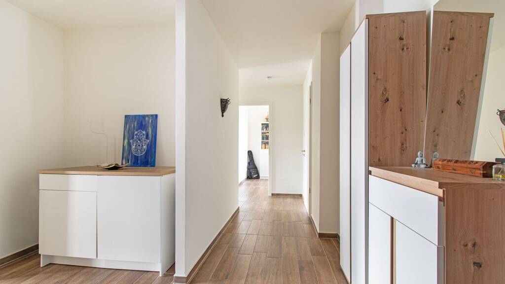 Hochwertige Bodenfliesen in Holzoptik und eine komfortable Fußbodenheizung verleihen allen Räumen eine warme und moderne Ausstrahlung. Für ein angenehmes Raumklima zu jeder Jahreszeit sorgt zusätzlich das integrierte Belüftungssystem. Die Wohnung ist zudem barrierefrei gestaltet und damit besonders komfortabel und zukunftssicher.