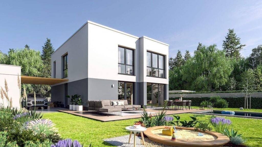 Wir errichten für Sie auf diesem Grundstück ein modernes Einfamilienhaus mit Flachdach und extensiver Begrünung. Auf 2 Vollgeschossen findet Ihre Familie genügend Platz für das Familienleben, welches Sie sich wünschen.