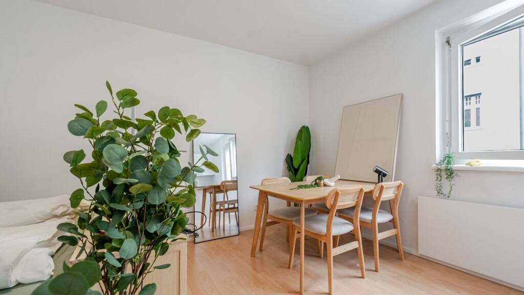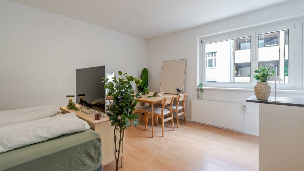 Komplett möbliert: Bett, Kleiderschrank, Tisch, Stühle, Smart-TV, WLAN, Deko