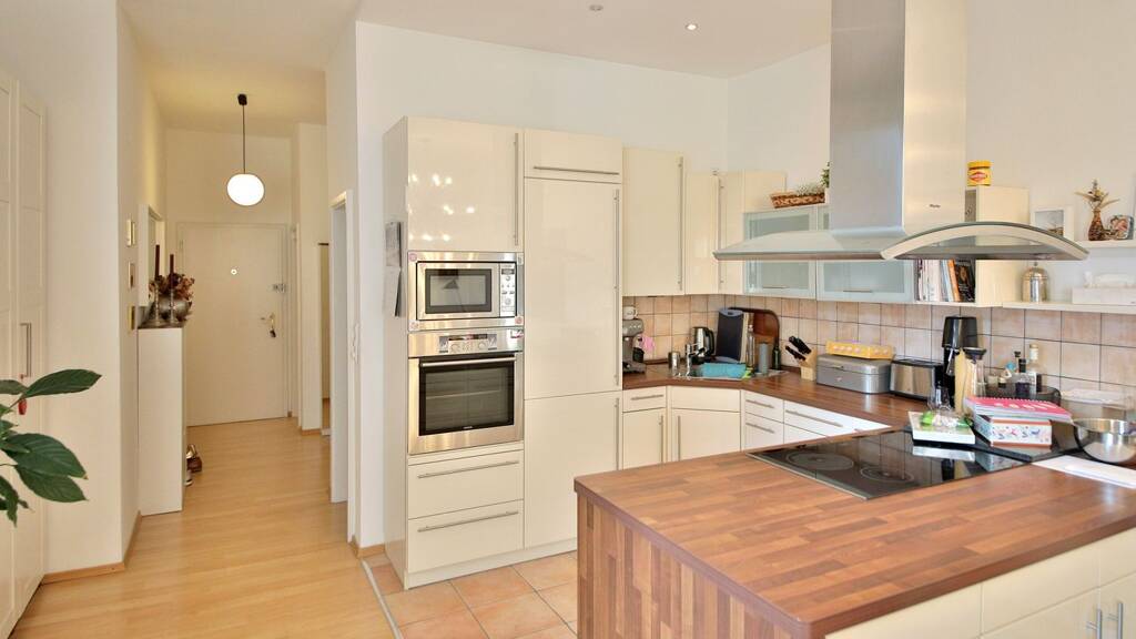 Die Küche ist modern gestaltet und vollständig ausgestattet, ideal für leidenschaftliche Hobbyköche und kulinarische Erlebnisse. Offene Gestaltungselemente schaffen eine Verbindung zwischen Kochbereich und Wohnraum und fördern ein geselliges Miteinander.