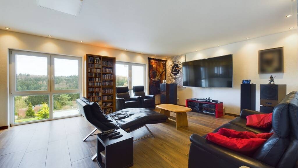 Das 1. Highlight des Hauses sind die beiden großzügigen und mit Fensterfronten verwöhnten Wohnzimmer mit Esszimmer und offener Küche. Durch die vielen Fenster im Wohnbereich mit Waldblick fühlt man sich mit der Natur im Einklang.