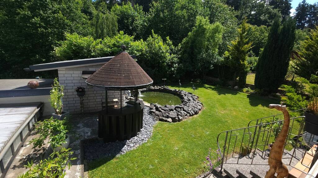 Das recht große Grundstück ist nach Süd- Ost ausgerichtet, sehr liebevoll angelegt, als Mittelpunkt der Koiteich mit Wasser Fontaine sowie diverse Freisitzplätze.