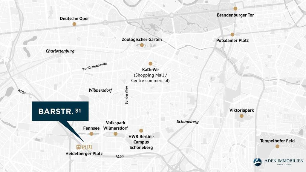 Die Barstraße liegt im Stadtteil Wilmersdorf in direkter Nähe zum schönen "Fennsee" und grünen "Volkspark Wilmersdorf". Beides sind Orte mit einem hervorragenden Erholungs- und Freizeitwert. Die ruhig gelegene Parallelstraße zur Mecklenburgischen Straße bietet eine optimale Verkehrsanbindung durch die S-und U-Bahnstation "Heidelberger Platz" (S41/42 + U3) sowie die Autobahnanbindung (A100).