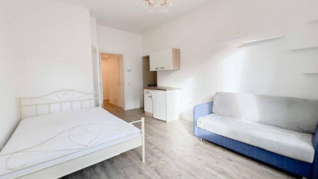 Der helle Wohnraum bietet ausreichend Platz zum Wohnen und Schlafen und verfügt über eine integrierte Kochnische. Die Möblierung umfasst unter anderem ein Bett, einen Kleiderschrank sowie ein Sofa. Das Sofa wurde kürzlich erneuert, zudem wird die Matratze vor dem Einzug noch ausgetauscht.
