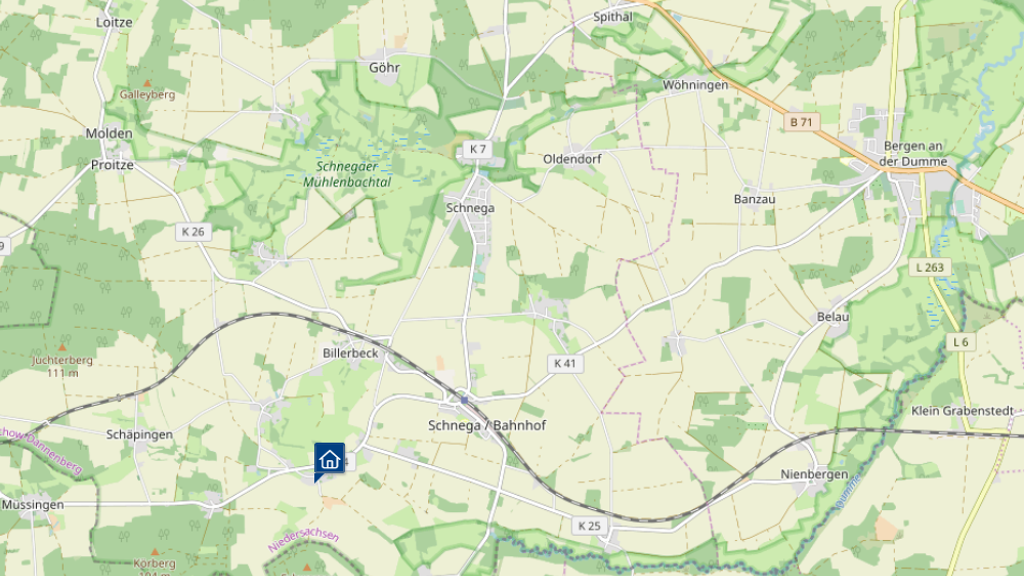 Die Gemeinde Schnega mit ihren 20 Ortsteilen - dieser Ortsteil ist ca. 1 Kilometer von Schnega entfernt - hat ca. 1.300 Einwohner und liegt im Südwesten des Wendlands. Sie ist ca. 16 Kilometer von der Kreisstadt Lüchow (ca. 10.000 Einwohnern) entfernt. Schnega bietet die Waren des täglichen Bedarfs in einem kleinen Einkaufsladen an, auch eine Tankstelle und Vereine sind vor Ort. Eine weitere gewachsene Infrastruktur befinden sich im 6 Kilometer entfernten Clenze. Hier sind sämtlichen Schulformen, verschiedene Ärzte, Einkaufsmöglichkeiten, Schwimmbad, gastronomische Betriebe und verschiedene Vereine ansässig. Im Umfeld bietet die weiträumige Natur einen hohen Erholungswert sowie vielfältige Freizeitmöglichkeiten für unterschiedlichste Aktivitäten. Ausflugsziele wie der Findlingspark "Clenzer Schweiz", Feuerwehrmuseuen (Tramm, Dannenberg) und ein Märchenpark (Salzwedel) sind bei Jung und Alt beliebt. Bahnhöfe mit Busverbindungen: Uelzen, Salzwedel, Dannenberg, Schnega