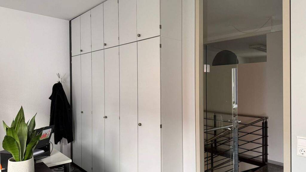 Im Obergeschoss (ca. 63 m²) befinden sich weitere Büroräume, eine Teeküche, ein WC sowie ein Aufenthaltsraum. Die Flächen sind gepflegt und mit Außenjalousien und Brüstungskanälen ausgestattet.