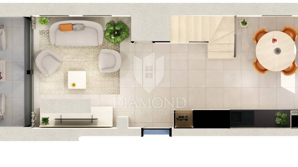 In einer ruhigen Siedlung nahe Porec, im Ort Rosini, steht eine zweigeschossige Neubauwohnung zum Verkauf, die hochwertige Bauweise, eine funktionale Raumaufteilung und eine hervorragende Lage mit Blick auf das Meer und die Natur vereint.