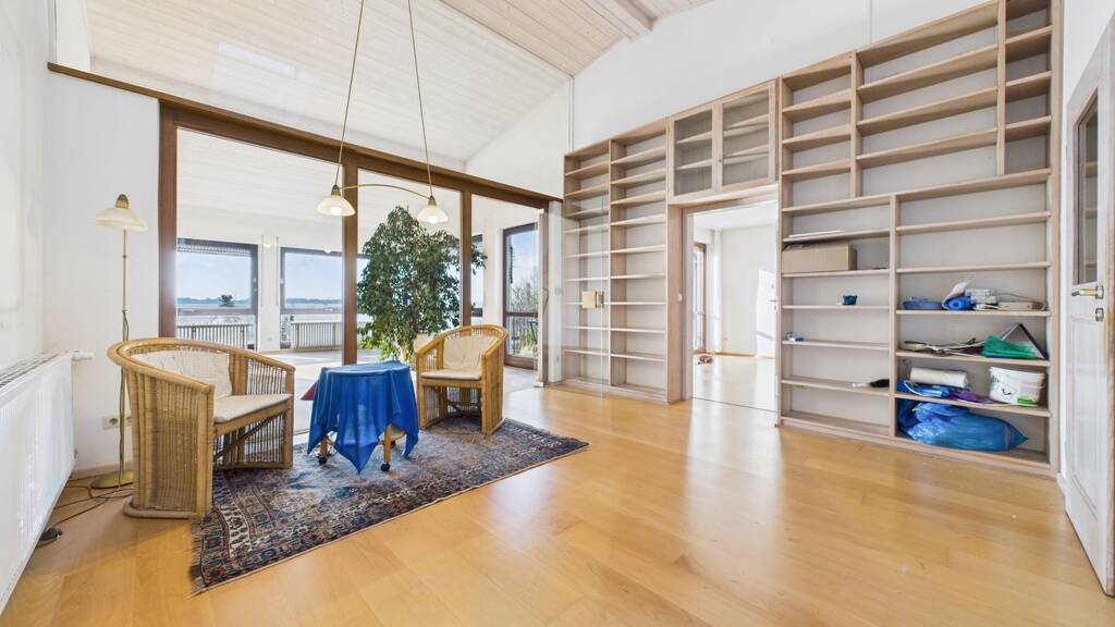 Diese außergewöhnliche Immobilie präsentiert sich als großzügiges Wohnkonzept auf zwei Ebenen, das Wohnen, Rückzug und Freizeit auf harmonische Weise verbindet. Im Obergeschoss befindet sich die zentrale Wohnebene. Das großzügige Wohnzimmer öffnet sich zum umlaufenden Balkon, von dem sich ein weiter, unverbaubarer Blick in die umliegende Natur eröffnet und der dem Wohnbereich eine besondere Aufenthaltsqualität verleiht. Angrenzend liegt das Esszimmer mit guter Anbindung an die separate Küche. Zwei Schlafzimmer bieten vielfältige Nutzungsmöglichkeiten, ergänzt durch ein großzügig geschnittenes Badezimmer sowie ein separates Gäste-WC, das den Wohnkomfort auf dieser Ebene abrundet. Das Erdgeschoss ist funktional und klar gegliedert. Geht man die Treppe hinab, erschließt sich links ein separater Wellnessbereich mit Indoorpool, Sitzgelegenheit und einem kleinen Badezimmer, ein privater Rückzugsort für Entspannung und Erholung. Rechts der Treppe befindet sich der wohnliche Teil dieser Ebene mit drei Zimmern, die flexibel als Schlaf-, Wohn- oder Arbeitszimmer genutzt werden können, einer separaten Küche sowie einem weiteren Badezimmer. Von einem der Schlafzimmer und vom Pool aus besteht Zugang zur großzügigen Terrasse, die ebenfalls mit einem eindrucksvollen Blick auf die Alpenkette überzeugt und zusätzlichen Raum im Freien schafft. Abgerundet wird dieses attraktive Angebot durch eine im Kaufpreis enthaltene Doppelgarage, die komfortablen Stellplatz und zusätzlichen Stauraum bietet.