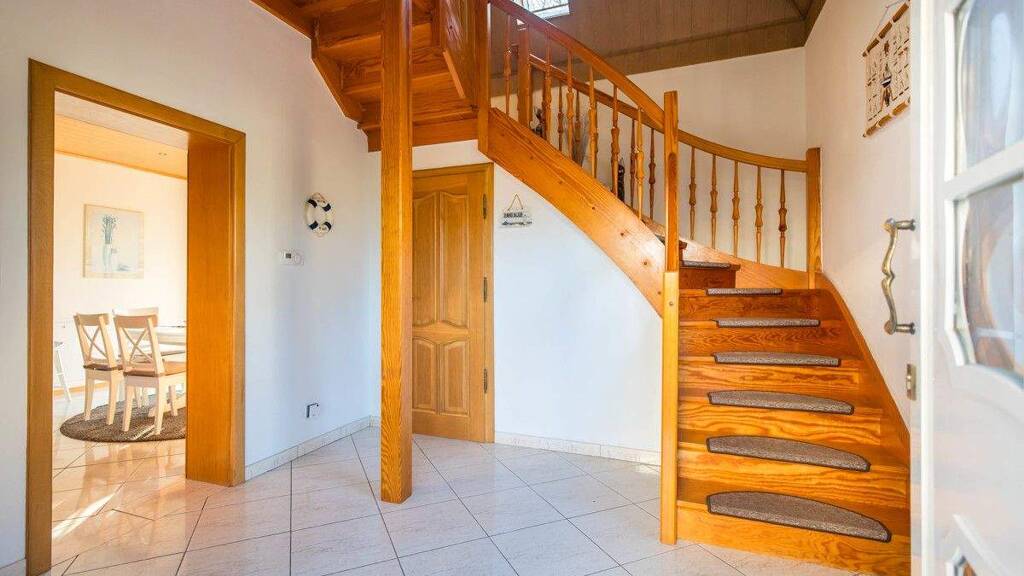 Der Eingangsbereich der Immobilie ist großzügig konzipiert worden und bietet somit Platz für Ihre Garderobe und Schuhschränke. Von hier aus haben Sie Zugang zu allen Bereichen des Erdgeschosses, was eine individuelle Nutzung aller Räume ermöglicht. Eine massive Holztreppe, welche optisch an die vorhandenen Holzbalken und Türzargen angepasst wurde, führt ins Obergeschoss. Dem Entree schließt sich die geräumige, ca. 12,50 m² große, Diele an, welche Platz für einen hellen Essbereich am bodentiefen Terrassenfenster mit Türelement bietet. Zudem sorgt ein heller Fliesenboden für zeitlose Atmosphäre.