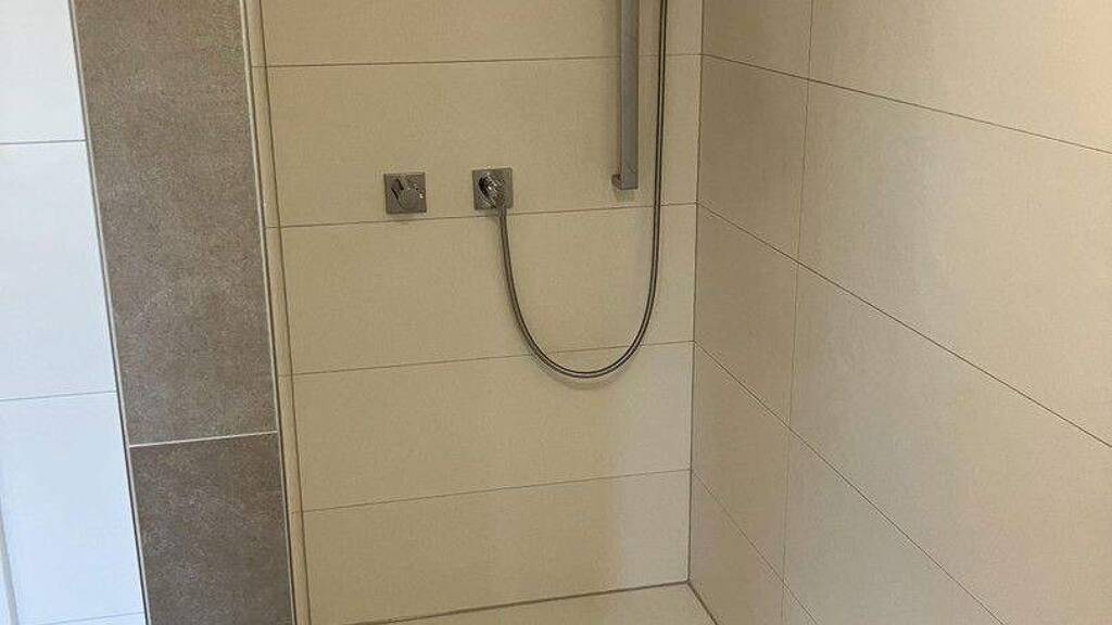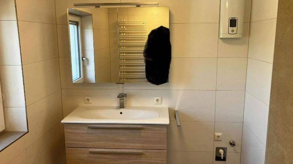 Badezimmer: Schlichtes, modernes Design mit effizientem Durchlauferhitzer für eine schnelle Warmwasseraufbereitung.