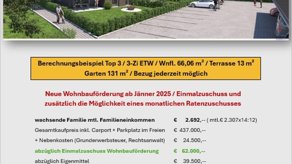 Die Wohnbauförderung des Landes Salzburg als geschenkter Zuschuss je nach Familiensituation, kann bis zu € 72.000,-- betragen.