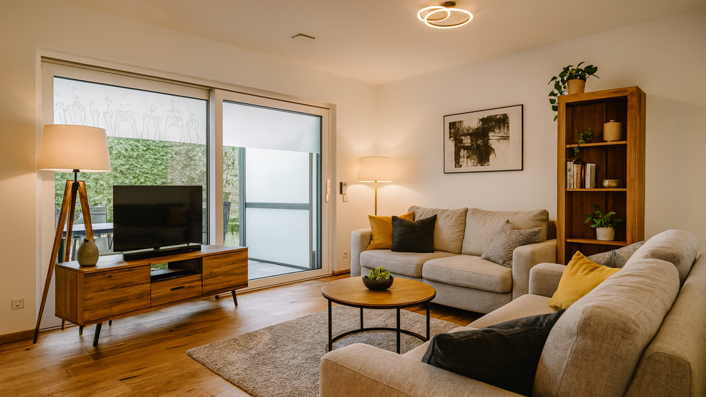 Warme Parkettböden in den Wohn- und Schlafbereichen sorgen für ein wohnliches Ambiente, während große Fensterflächen die Räume mit Tageslicht durchfluten. Der offen gestaltete Wohn- und Essbereich ist der Mittelpunkt des Zuhauses - hier verbringen Sie gemütliche Abende, empfangen Freunde oder genießen einfach einen ruhigen Moment für sich. Vom Wohnbereich gelangen Sie direkt auf die sonnige Terrasse mit angrenzendem, eigenen Gartenanteil - ein geschützter Rückzugsort im Freien.