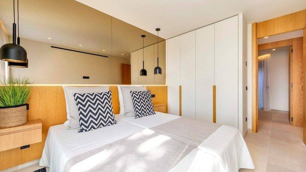 Die exklusive Anlage besteht aus vier Bl?cken mit je acht Einheiten, die jeweils ?ber vier Doppelschlafzimmer und zwei B?der en suite sowie Marmorb?den im Innen- und Au?enbereich verf?gen. Die Sanit?ranlagen sind mit Duravit- oder ?hnlichen Produkten, h?ngenden Toiletten, Grohe- oder ?hnlichen Armaturen, Miele-Ger?ten und einem Weink?hlschrank ausgestattet. Das KNX Zennio Smart Home System erm?glicht es Ihnen, Licht, Rolll?den, Klimaanlage (Daikin) und Fu?bodenheizung separat zu steuern.