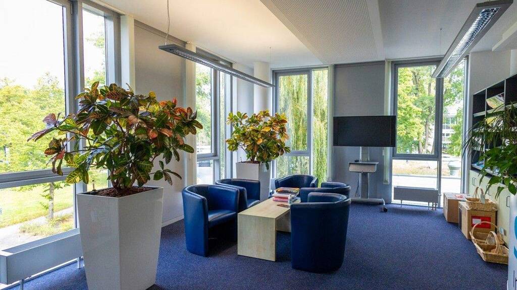 Arbeitsplatzbeleuchtungen mit hochwertigen Pendelleuchten, sowie schallabsorbierende Lochdecken sorgen für eine hervorragende Arbeitsatmosphäre. Komfortable Bodentanks bieten ausreichend Platz für die EDV-und Telefonanschlüsse. Die Flächen sind mit Decken- Umluftkühlgeräten ausgestattet, die ein angenehmes Raumklima im Sommer ermöglichen.