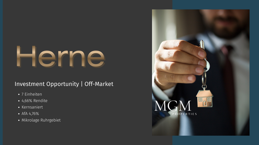 Zum Verkauf steht ein modernisiertes Wohnobjekt in charakteristischer Klinkerarchitektur, dessen Ursprung bis 1918 zurückreicht und das 2021 vollständig erneuert wurde. Die Liegenschaft umfasst sieben individuell geschnittene Wohneinheiten (ca. 46-140 m², 2-5 Zimmer) - jeweils mit eigenem Außenstellplatz. Das Objekt befindet sich in einem gepflegten Vermietungszustand und generiert derzeit jährliche Nettoerträge von rund € 67.539. Für Anleger besonders interessant ist der erhöhte AfA-Satz von 4,76 % p. a., der eine effiziente steuerliche Gestaltung ermöglicht. Käufer profitieren zudem von unserer Finanzierungspartnerschaft mit einem führenden, bankenübergreifenden Dienstleister und erhalten dadurch Zugang zu attraktiven Konditionen unterschiedlicher Institute. Detaillierte Unterlagen stellen wir ausschließlich im persönlichen Austausch bereit.