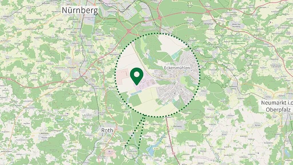 Eckersmühlen liegt im mittelfränkischen Landkreis Roth, verkehrsgünstig gelegen mittig zwischen der A9 und der B2, die zur A6 führt.