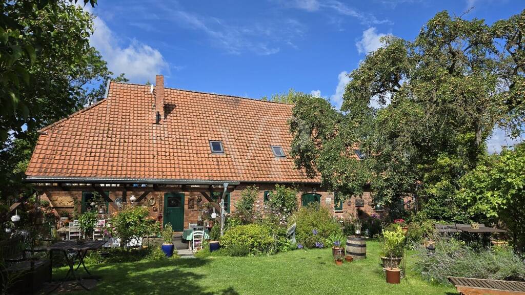 Die großzügige, 2018 erneuerte überdachte Terrasse schafft einen ansprechenden Ort für gesellige Stunden im Freien, während der anspruchsvoll angelegte Bauerngarten und die Grillkate die Möglichkeiten zur Entspannung und zum Austausch im Grünen erweitern.
