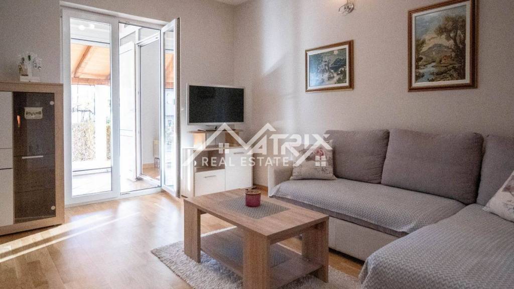 Die Wohnung besteht aus einem geräumigen Wohnzimmer, das mit der Küche verbunden ist, zwei gemütlichen Schlafzimmern, einem Eingangsflur, einem modernen Badezimmer und einem Abstellraum, der zusätzlichen Komfort bietet. Die geschlossene Loggia wurde als Essbereich umgestaltet, während die überdachte Terrasse von 15 m² einen gemütlichen Platz bietet, um die frische Luft und die ruhige Umgebung zu genießen.