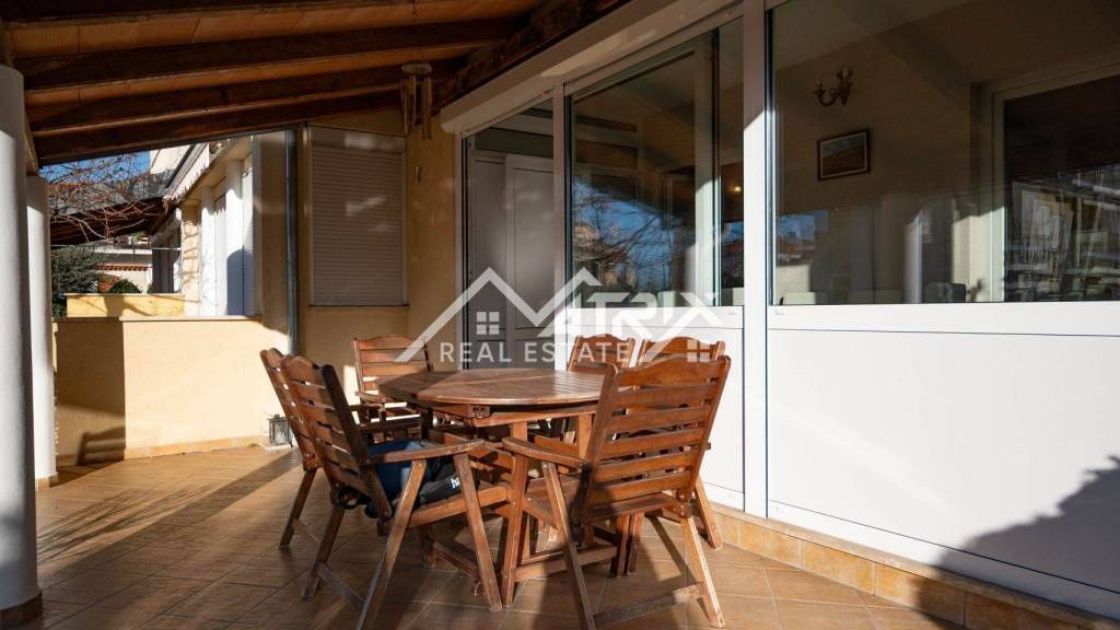 Der gepflegte Garten rund um die Wohnung bietet zahlreiche Annehmlichkeiten, darunter einen Grillbereich mit Kamin und Esstisch, ein Gartenhäuschen für Werkzeuge und einen kleinen Obstgarten mit mediterranen Pflanzen und Zitrusbäumen. Mit zwei separaten Eingängen ist der Garten besonders praktisch und funktional. Zur Wohnung gehört auch ein überdachter Parkplatz, der sich direkt hinter dem Gebäude befindet.