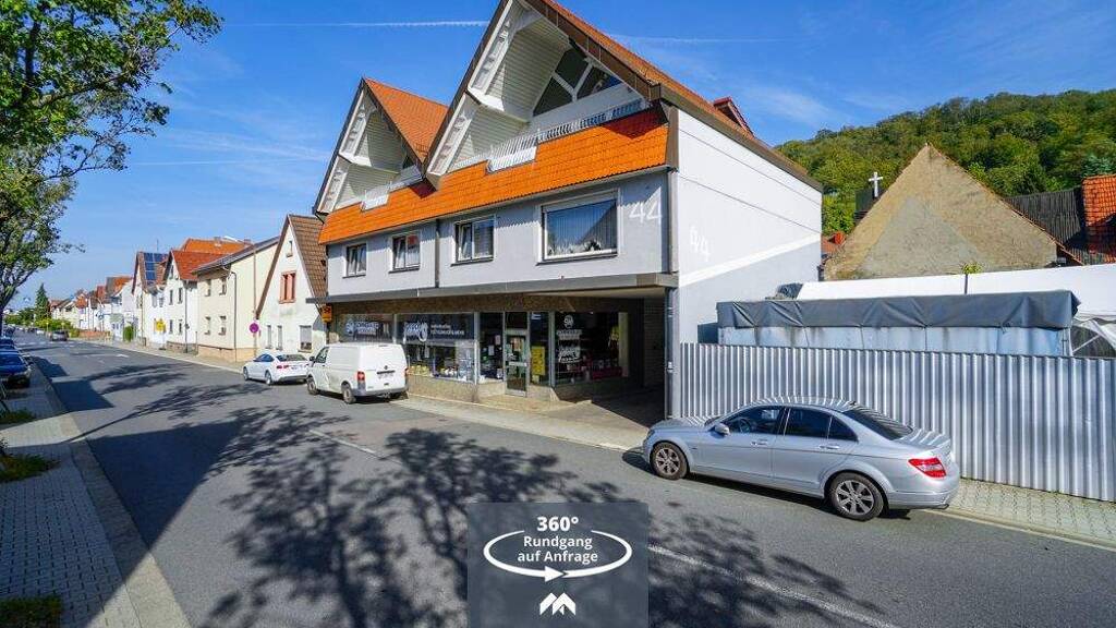 Das Angebot besteht aus zwei Grundstücken. Flurstück Nr. 51 hat eine Größe von 766 m² und ist mit einem Wohn- und Geschäftshaus aus dem Jahr 1974 bebaut. Der Dachgeschossausbau erfolgte Mitte der 90er Jahre. Das östlich angrenzende Flurstück Nr. 51/1 hat eine Größe von 318 m². Auf diesem befindet sich ein Garagen- und Lagergebäude.