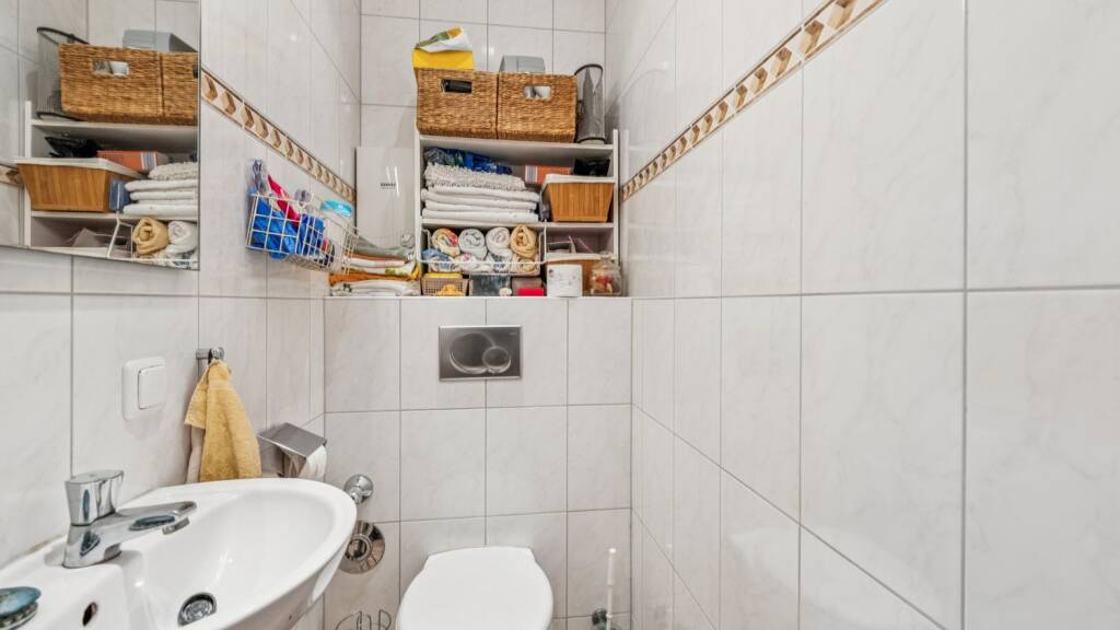 Das Badezimmer ist mit einer Badewanne ausgestattet und wird durch ein separates Gäste-WC ergänzt, was den Wohnkomfort deutlich steigert und sich positiv auf die Vermietbarkeit auswirkt.