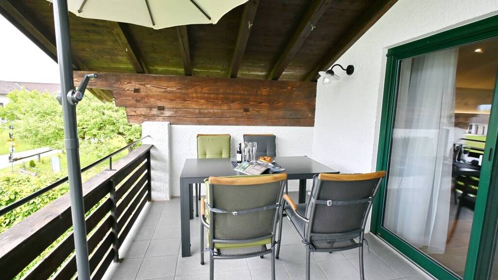 Der großzügige Südbalkon ist direkt vom Essbereich und Wohnzimmer aus zugänglich und lädt mit gemütlicher Sitzgruppe und Liegestühlen zum Entspannen und Genießen des Bergblicks ein.