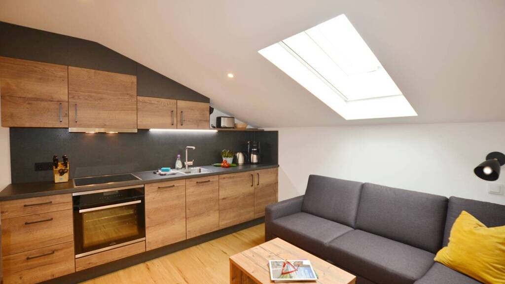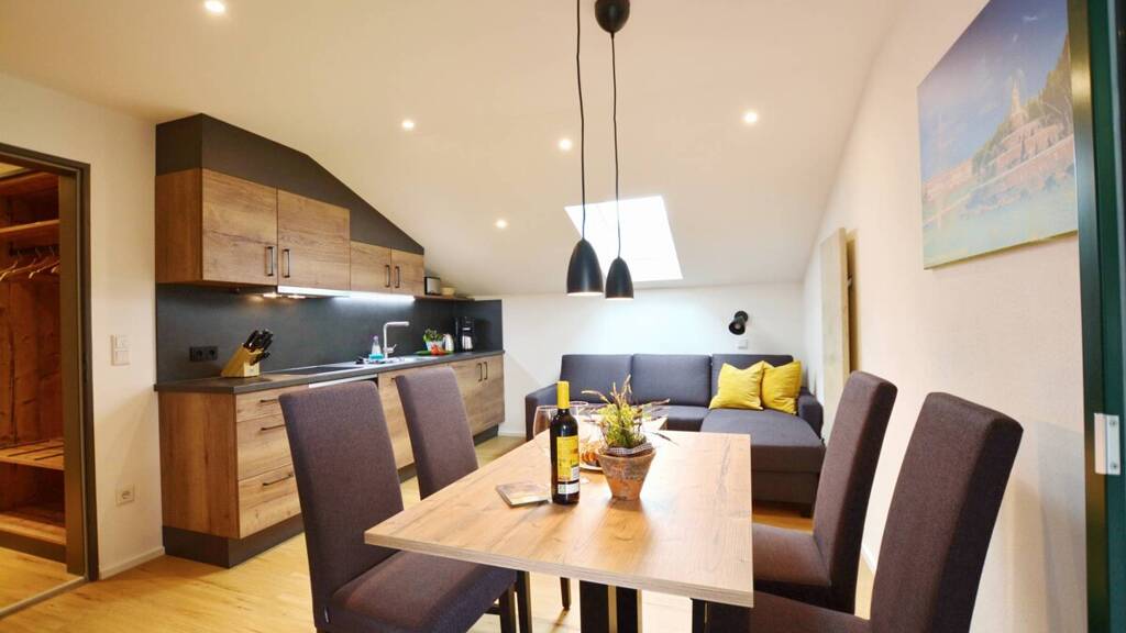 Der Eingangsbereich bietet Platz für die Garderobe und mehr. Der Ess- und Kochbereich mit voll ausgestatteter Küche und zusätzlich einem gemütlichem Sofa bietet eine einladende Atmosphäre für gemeinsame Stunden.