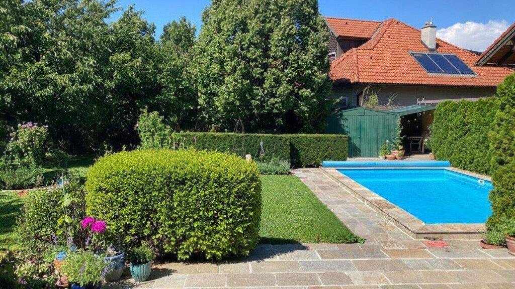 Auch der Außenbereich überzeugt mit viel Platz zum Entspannen und Genießen. Zwei Terrassen mit insgesamt rund 28 m² laden zu gemütlichen Stunden im Freien ein. Der gepflegte Garten verfügt außerdem über einen schönen Pool, eine Gartenhütte sowie einen Holzlagerplatz und bietet damit ideale Voraussetzungen für erholsame Stunden im eigenen Zuhause.