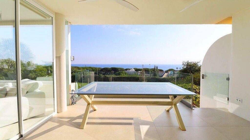 Diese Wohnung verfügt über drei geräumige Schlafzimmer, darunter das Hauptschlafzimmer mit eigenem Bad, das mit Badewanne und Dusche ausgestattet ist. Die beiden anderen Schlafzimmer teilen sich ein modernes Badezimmer. Beide Bäder sind aus Mikrozement gefertigt und wirken dadurch hell und funktional. Das helle Wohnzimmer mit seinen bodentiefen Fenstern bietet einen Panoramablick auf das Meer, ist lichtdurchflutet und schafft eine gemütliche Atmosphäre. Die offene Designerküche ist mit hochwertigen Geräten ausgestattet und ideal für Hobbyköche und gesellige Runden. Die Einrichtung in natürlichen und neutralen Tönen vermittelt ein Gefühl von Eleganz und Komfort. Die große Terrasse mit Blick auf das Mittelmeer lädt zum Frühstück in der Sonne oder zu einem Abend unter dem Sternenhimmel ein. Zur Wohnung gehören außerdem eine Garage und ein Abstellraum.