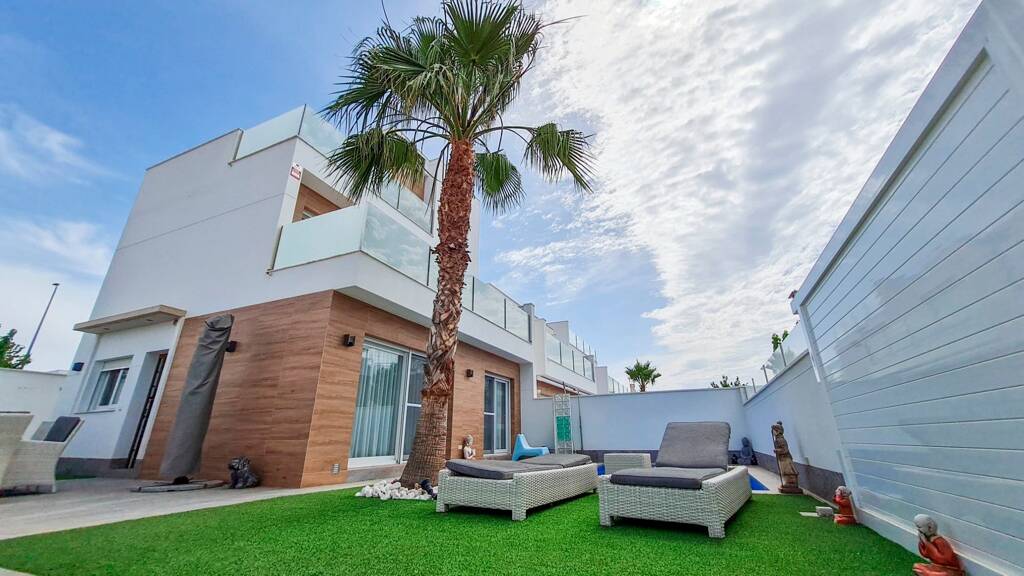 Eine schöne, freistehende Villa im zeitgenössischen Stil mit 4 Schlafzimmern, 3,5 Bädern und privatem Pool in Pilar de la Horadada (Alicante), nur wenige Gehminuten von einer Reihe von Annehmlichkeiten entfernt und in der Nähe der schönen Strände von Torre de la Horadada, El Mojón und Mil Palmeras.
