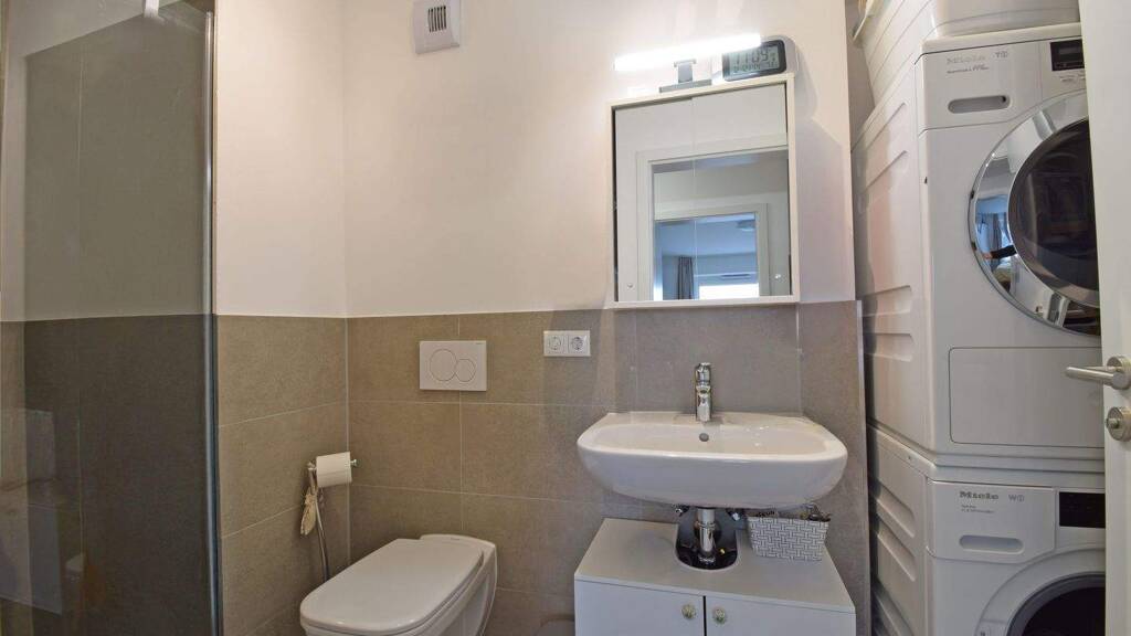 Der Sanitärbereich ermöglicht durch modernste Ausstattung einen gehobenen Komfort, welcher keinerlei Wünsche offen lässt. Es wurden selbstverständlich ausschließlich Markenfabrikate namhafter Hersteller verwendet. Passende Anschlüsse für eine Waschmaschine und einen Trockner sind ebenfalls im Bad untergebracht.