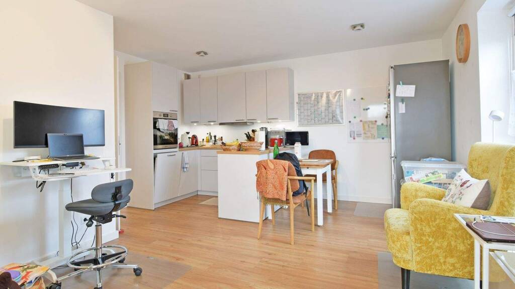 Besonders einladend ist der Wohn- und Essbereich, welcher durch eine offene Gestaltung, großzügige Deckenhöhen und viel natürliches Licht das Herzstück der Wohnung bildet. Die voll ausgestattete, offene Küche ist mit mattgrauen Fronten und einer Arbeitsplatte in Eichenholzoptik ein echter Hingucker. Alle notwendigen E-Geräte sind hierbei bereits vorhanden.