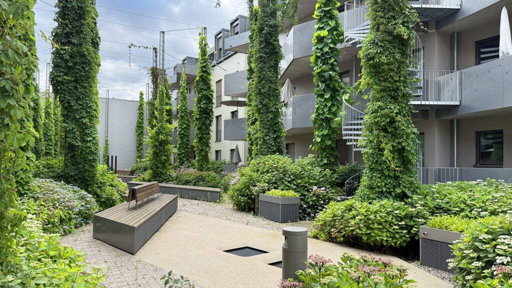 Der grüne Innenhof über der Tiefgarage, mit Hortensien und wildem Wein bepflanzt, lädt zum Verweilen ein und sorgt für angenehm kühle Temperaturen im Sommer.