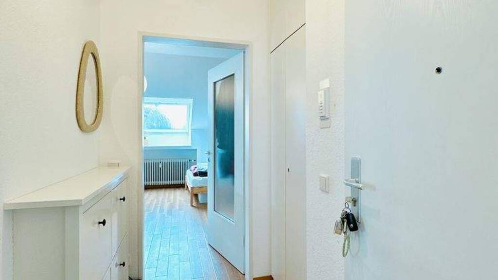 Beim Betreten der charmanten Dachgeschosswohnung empfängt Sie eine längliche Diele, die einen angenehmen ersten Eindruck vermittelt. Auf der rechten Seite befindet sich ein praktischer Abstellraum, der wertvollen Stauraum für Haushaltsutensilien, Vorräte oder Reinigungsgeräte bietet. Linkerhand liegt das Badezimmer, das durch ein Dachflächenfenster mit reichlich Tageslicht versorgt wird. Das Bad ist klassisch weiß gefliest und zeitlos gestaltet. Es verfügt über ein Waschbecken, eine Badewanne, ein WC sowie eine Heizung und bietet damit alles, was man für den täglichen Komfort benötigt. Als nächstes erreichen Sie die Küche, die ebenfalls über ein Fenster verfügt - ideal zum Lüften nach dem Kochen. Links und rechts stehen ausreichend Stellflächen für Küchenmöbel und Elektrogeräte zur Verfügung. Die auf den Fotos abgebildete Einbauküche gehört der derzeitigen Mieterin und kann bei Interesse gegen eine Abschlagssumme übernommen werden. Ein pflegeleichter Fliesenspiegel aus weißen Fliesen sorgt für eine einfache Reinigung und rundet den funktionalen Charakter der Küche ab. Das Herzstück der Wohnung bildet der großzügige Schlaf-Wohn-Essbereich. Der gut geschnittene Raum bietet vielfältige Gestaltungsmöglichkeiten: Ob gemütlicher Sofa- und Fernsehbereich, ein einladender Essplatz oder ein harmonisch integrierter Schlafbereich - hier lässt sich Wohnen und Leben optimal vereinen. Auch dieser Raum ist mit einem Dachflächenfenster ausgestattet, das für eine angenehme, helle Wohnatmosphäre sorgt. Vom Wohnbereich aus gelangen Sie auf den Balkon mit Ost-Ausrichtung, der zu entspannten Morgenstunden und sonnigen Frühstücken im Freien einlädt.
