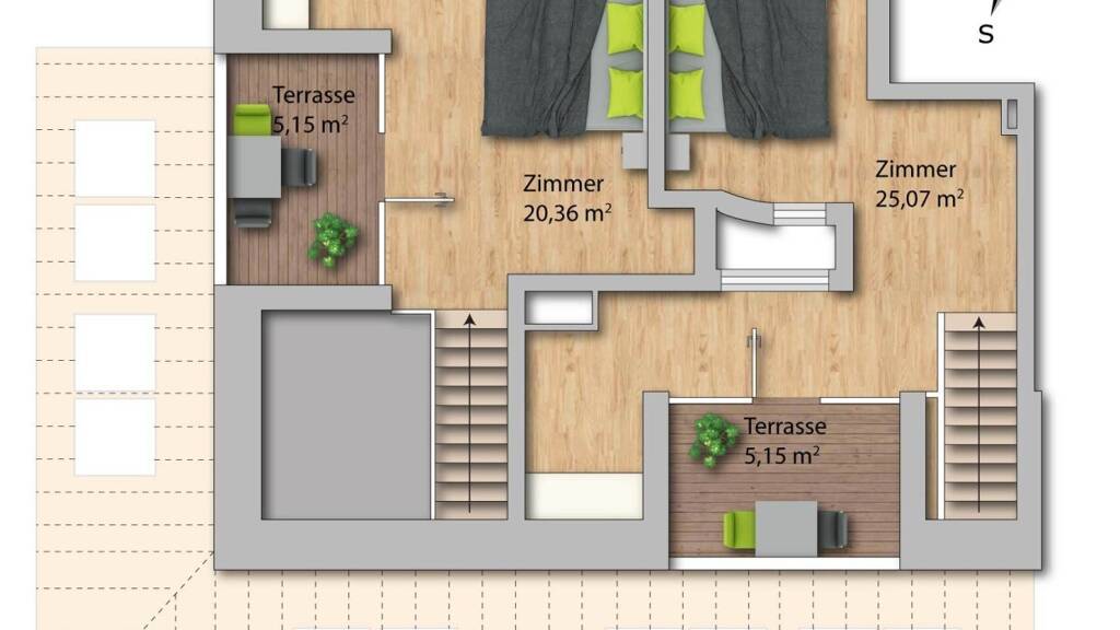 Zweite Ebene: Zimmer mit Ausgang auf die westseitige Terrasse (ca. 5m²), Zimmer mit Ausgang auf die südseitige Terrasse (ca. 5m²)