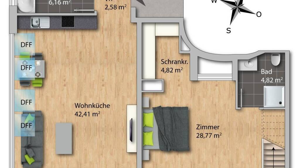Top 8 verfügt über eine Wohnfläche von rund 133m² und verteilt sich auf zwei Ebenen. Die erste Ebene befindet sich im 2. OG und erreichen Sie bequem mit dem Lift.