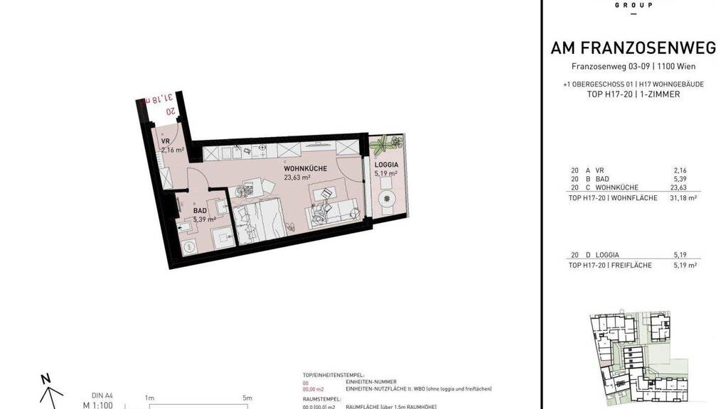 Stichworte Stellplatz vorhanden, Tiefgarage vorhanden, Fahrradraum, Nutzfläche: 31,18 m², Gesamtfläche: 36,39 m², Anzahl Loggias: 1, Balkon-Terrassen-Fläche: 5,19 m², Kellerfläche: 2,06 m², Bundesland: Wien, 4 Etagen, Wohnungsnr.: H17-20