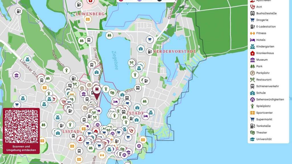 Der Stadtkern Schwerins mit seinen zahlreichen Cafés, Läden und Shoppingcenter liegt nur ein paar hundert Meter entfernt. Aus kultureller Sicht hat diese Lage ebenfalls ihre Reize. In wenigen Minuten erreichen Sie per Fahrrad oder ÖNV den Zoo, das Meckl. Staatstheater, genießen das Open Air Theater, Schloss, Museum, die Gärten des 21. Jahrhunderts im Schlossgarten oder die Innenstadt mit ihren zahlreichen Beispielen einer bewundernswerten Architektur.