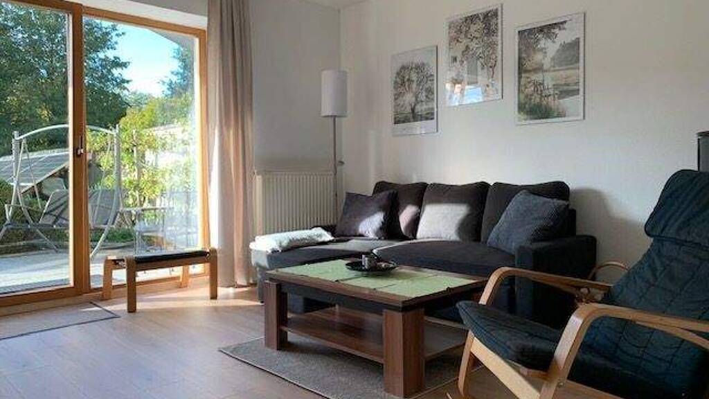 Diese ansprechend-modern möblierte 2-Zimmerwohnung befindet sich im Erdgeschoss eines freistehenden Zweifamilienhauses, in einer ruhigen Wohnstraße mit viel Begrünung. Das geräumige Wohnzimmer geht durch die bodentiefen Fenstertüren über in die große Terrasse. An den warmen und trockenen Tagen bildet diese einen zweiten Wohnbereich mit der Möglichkeit zur Erholung und auch der Bewirtung von Gästen. Das Schlafzimmer mit Einzelbett, Kleiderschrank und einem kleinen Arbeitstisch bietet ausreichend Platz für eine Person. Gäste können im Wohnzimmer auf der Schlafcouch übernachten. Die separate, gut ausgestattete Küche mit Essplatz erlaubt auch die Zubereitung aufwendiger Mahlzeiten. Im ansprechenden Duschbad mit Fenster befindet sich auch die Waschmaschine.