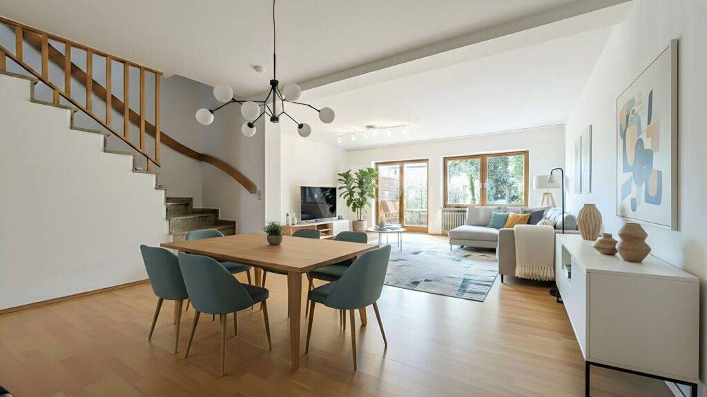 Das große Wohn-Esszimmer sowie die angrenzenden Räume bieten viel Platz und optimalen Wohnkomfort. Die Fenster lassen viel Tageslicht herein und sorgen für eine helle und freundliche Atmosphäre - mit Blick auf die angrenzende Terrasse, welche nach Süd-West ausgerichtet ist und in den ebenerdigen Garten führt. Der Gartenbereich ist pflegeleicht angelegt und bietet vielfältige Gestaltungsmöglichkeiten. Eine angrenzende Treppe führt direkt zu den Kellerräumen im Untergeschoss.