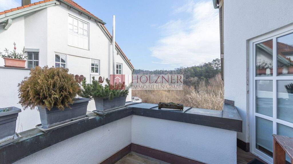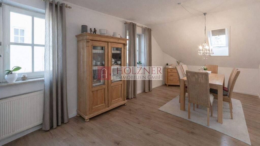 Die Küche liegt leicht verwinkelt hinter dem Wohn- und Essbereich, geschickt ums Eck angeordnet und mit einem Dachfenster ausgestattet, das für angenehmes Tageslicht sorgt. Diese Raumlösung schafft eine offene, kommunikative Atmosphäre, ohne dabei auf gemütliche Rückzugsmöglichkeiten zu verzichten. Zwei gut geschnittene Schlafzimmer bieten ausreichend Platz und verfügen jeweils über einen direkten Zugang zum Balkon. Das teilsanierte Badezimmer präsentiert sich in gepflegtem Zustand, während ein kleiner Hauswirtschaftsraum mit Anschlüssen die Option für ein zusätzliches Gäste-WC bietet.