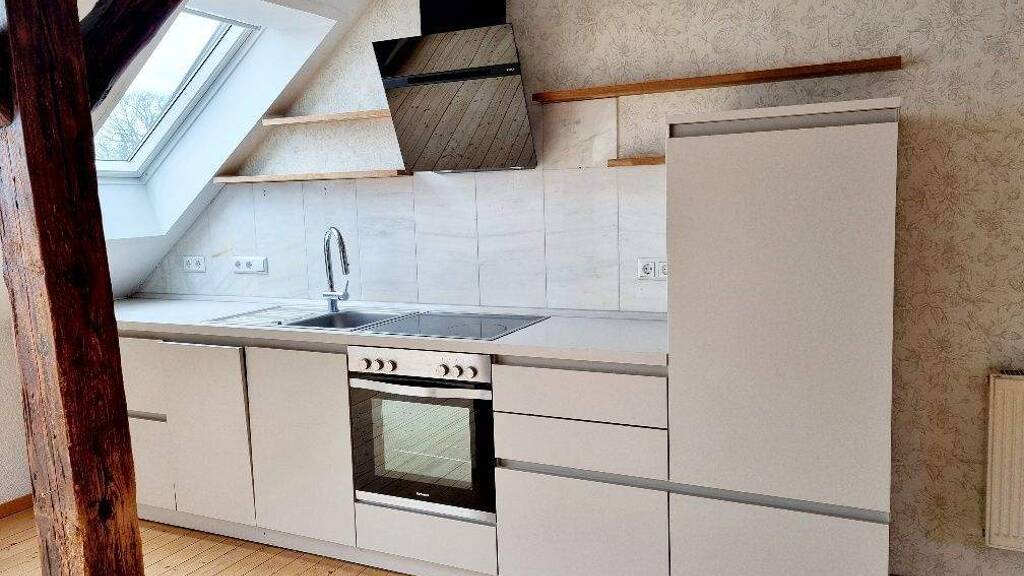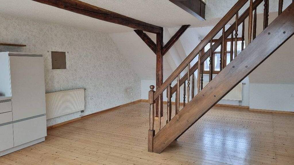 Die hübsche Wohnung im Dachgeschoss hat einen individuellen Grundriss und bietet einen offen Wohnbereich.