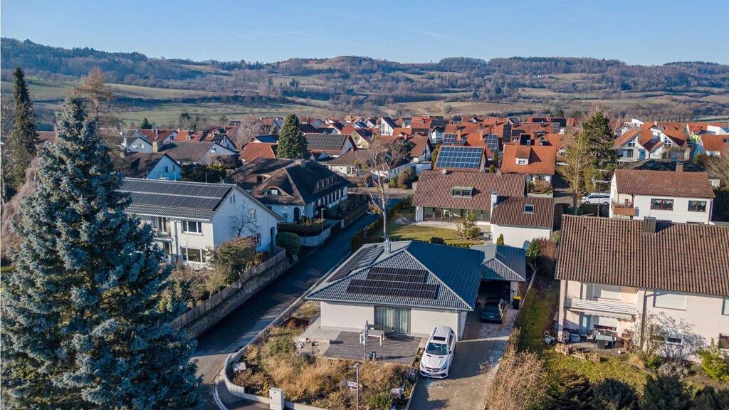 Willkommen zu Ihrem neuen Zuhause in Singen! In bevorzugter und ruhiger Wohnlage befindet sich dieses moderne Einfamilienhaus aus dem Baujahr 2023, das durch seine erstklassige Bauweise, ein durchdachtes Raumkonzept und zeitlose Eleganz überzeugt. Auf einem ca. 620 m² großen Grundstück bietet die Immobilie rund 135 m² Wohnfläche und richtet sich an anspruchsvolle Käufer, die Wert auf Qualität, Komfort und Nachhaltigkeit legen. Der offen gestaltete Wohn- und Essbereich mit einer Deckenhöhe von ca. 2,60 m wird durch großflächige, dreifach verglaste Fenster mit elektrischen Lamellen lichtdurchflutet. Edle Vinylböden in Kombination mit einer Fußbodenheizung schaffen ein angenehmes und modernes Wohngefühl. Die moderne Einbauküche entspricht dem neuesten Stand, ist mit maßgefertigten Einbauschränken sowie eleganten Keramikarbeitsplatten ausgestattet und fügt sich harmonisch in den offenen Wohn- und Essbereich ein. Von hier aus besteht ein direkter Zugang zur Terrasse. Ein stilvoll integrierter Kamin sorgt zusätzlich für eine behagliche Wohnatmosphäre. Das Haus verfügt über drei Schlafzimmer, die jeweils mit großzügigen Fensterflächen sowie praktischen Einbauschränken ausgestattet sind. Das Gäste-WC bietet eine bodengleiche Dusche und eine raumhohe Verfliesung mit ausgesuchten Materialien. Das Hauptbad ist mit einer Badewanne sowie einem WC ausgestattet; sämtliche Sanitärobjekte stammen aus namhaften Serien. Alle Türen sind barrierefrei ausgeführt. Eine kontrollierte Wohnraumlüftung in allen Räumen sorgt dauerhaft für ein angenehmes und gesundes Raumklima. Energetisch erfüllt die Immobilie den KfW-55-Standard und wird über eine effiziente Wärmepumpe in Kombination mit einer Photovoltaikanlage samt 12-kWh-Batteriespeicher versorgt. Neben den Stellplätzen auf dem Grundstück bietet auch die großzügig Garage komfortablen Raum für Fahrzeuge. Angrenzend befindet sich der Technik- und Hauswirtschaftsbereich. Der Hauswirtschaftsraum mit Waschmaschinenanschluss und Wasserenthärtungsanlage verfügt über zusätzliche Abstellmöglichkeiten. Von hier aus gelangt man in den rückwärtigen Grundstücksbereich, der vielfältige Gestaltungsmöglichkeiten bietet und ausreichend Platz für individuelle Wünsche wie einen Grillbereich, eine Außensauna oder weitere Freizeitideen lässt. Ein besonderes Entwicklungspotenzial bietet der Dachboden mit einer Deckenhöhe von bis zu 8,90 m, der den Ausbau einer weiteren Wohnebene ermöglicht. Diese Immobilie vereint moderne Architektur, durchdachte Ausstattung und eine begehrte Lage zu einem exklusiven Gesamtangebot. Vereinbaren Sie noch heute ein Besichtigungstermin und überzeugen Sie sich von diesem einmaligen Angebot. KB Immobilien freut sich, Ihnen Ihr neues Zuhause zu präsentieren.