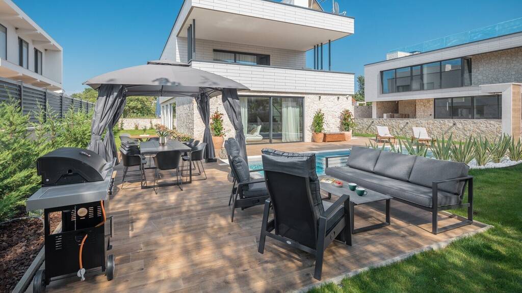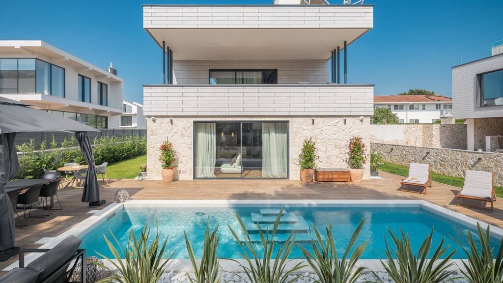 Sie befindet sich unweit von der Stadt Porec und nur 500 m vom Meer entfernt. Die Villa selbst verfügt über eine Nutzfläche von ca. 180 m2 und befindet sich auf einem Grundstück von 700 m2. Sie hat fünf Schlafzimmer und fünf Badezimmer, von denen vier Badezimmer en suite sind.