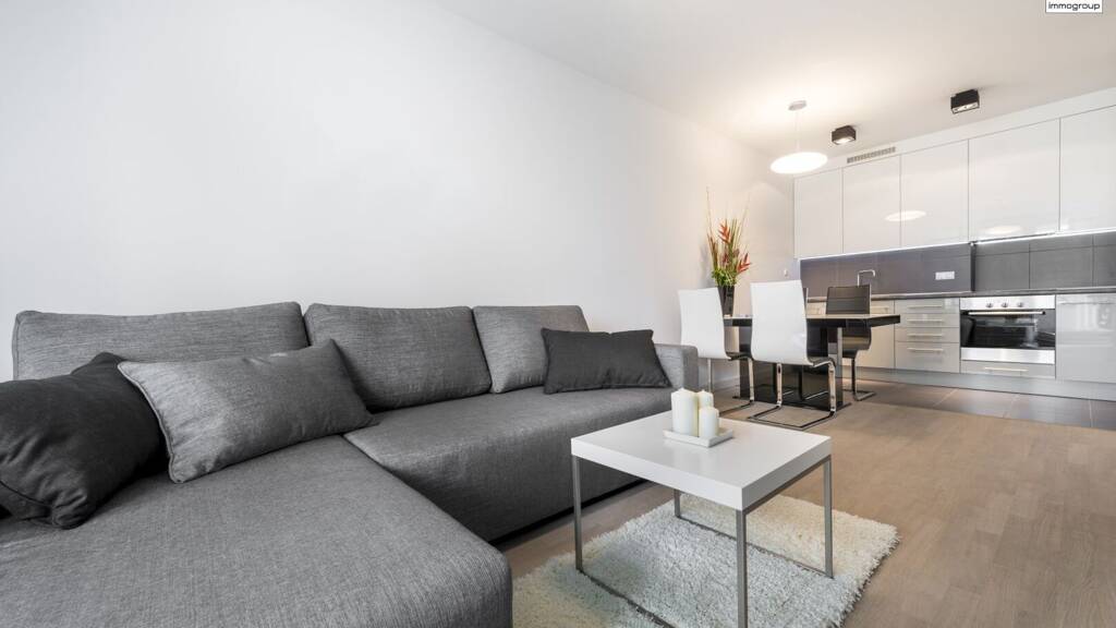 Der offene Wohn-Essbereich mit direktem Zugang zum Außenbereich schafft ein luftiges Raumgefühl und bietet genügend Platz für individuelles Wohnen. Zwei ruhige Schlafzimmer lassen sich flexibel als Schlaf-, Arbeits- oder Gästezimmer nutzen. Das Badezimmer ist stilvoll ausgestattet.