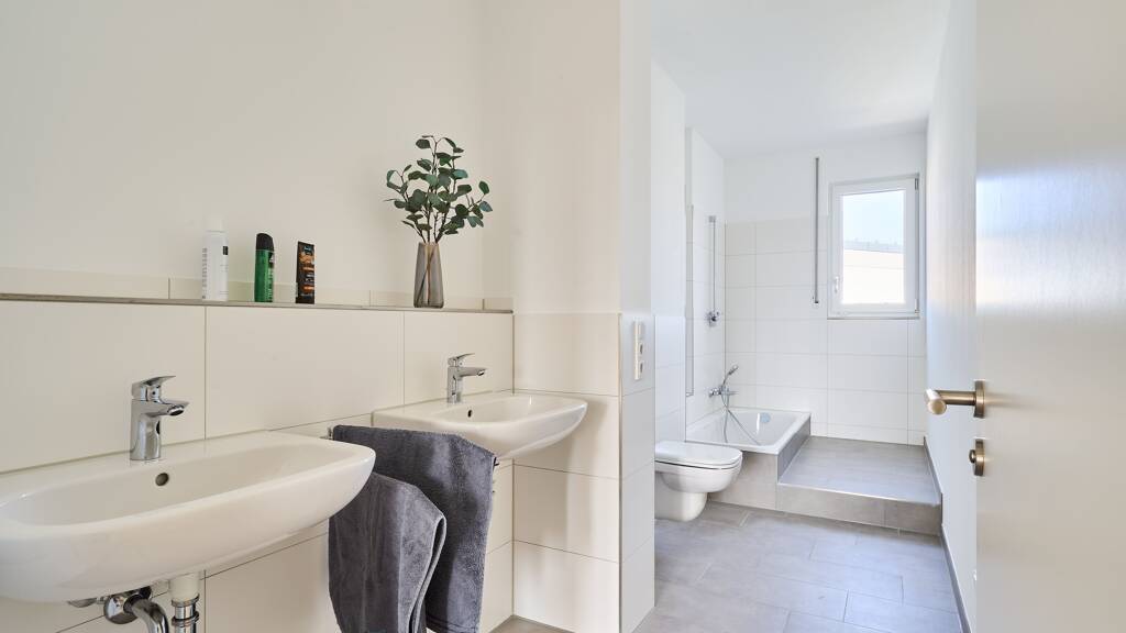 Das Bad im Obergeschoss überzeugt mit einer großzügigen einer Badewanne, einem WC und zwei Waschbecken.