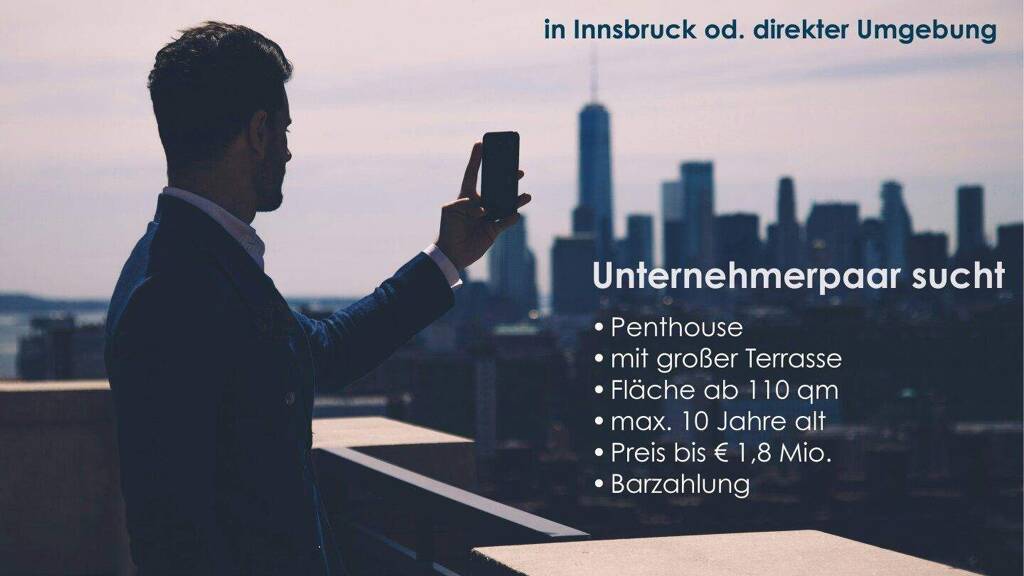 Ein Unternehmerpaar sucht ein Penthouse in Innsbruck oder in direkter Umgebung. Gewünscht wird eine Immobilie mit großer Terrasse und einer Wohnfläche ab etwa 110 Quadratmetern. Das Penthouse sollte maximal zehn Jahre alt sein. Der Kaufpreis kann bis zu 1,8 Millionen Euro betragen. Die Finanzierung erfolgt per Barzahlung, eine rasche und diskrete Abwicklung wird zugesichert.